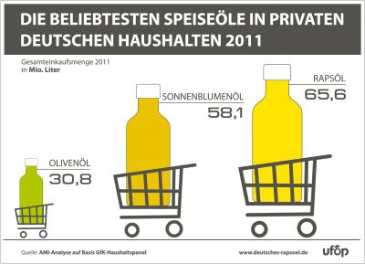 Rapsöl gehört zu den erfolgreichsten Produkten im deutschen Lebensmitteleinzelhandel. Sein Marktanteil lag 2011 bei 37,3 Prozent*. Jeder Haushalt hat im Schnitt rund 1,7 Liter Rapsöl konsumiert. Insgesamt 65,6 Millionen Liter waren es im vergangenen Jahr. Damit hat Rapsöl seinen Vorsprung vor Sonnenblumenöl (33,0 Prozent/ 58,1 Millionen Liter) und Olivenöl (17,5 Prozent/ 30,8 Millionen Liter) nochmals ausbauen können. Insgesamt haben deutsche Verbraucher 2011 rund 176,1 Millionen Liter Speiseöl eingekauft.