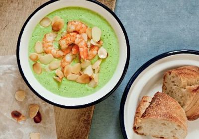 Rezept-Tipp: Brokkolicremesuppe mit Garnelen und Mandelblättchen (Für 4 Personen)